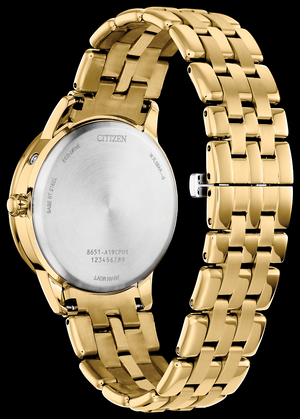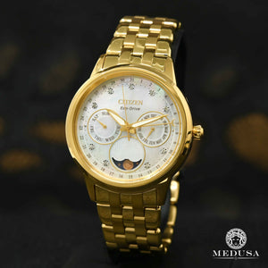 La toute dernière montre pour femmes Calendrier de Citizen allie raffinement esthétique et technologie de pointe. Le boîtier en acier inoxydable aux teintes or met en valeur le cadran analogique en nacre blanc. Cette montre affiche non seulement l’heure, mais également le mois, le jour et la date ainsi que les phases lunaires. Neuf diamants scintillants ornent splendidement le cadran pour un summum d’élégance. Le bracelet en acier inoxydable aux teintes or s’attache aisément à l’aide d’un fermoir déployant. Dotée de la technologie durable Eco‑Drive de Citizen, cette montre est alimentée par la lumière sous toutes ses formes. Conjuguant à merveille prestance et précision extraordinaire, elle rehaussera à coup sûr votre styl