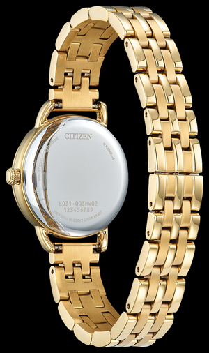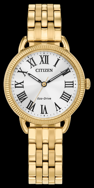 Une touche moderne sur un design classique. Dotée d'un élégant boîtier doré avec une lunette texturée à bord de pièce et un cadran argenté à 3 aiguilles avec des chiffres romains audacieux, cette montre élégante se démarque de la foule tout en restant discrète. Une boucle déployante en acier inoxydable doré attache cette montre pour un look minimaliste. Alimentée de manière durable par la lumière grâce à la technologie Eco-Drive, cette montre n'a jamais besoin de pile et offre un look raffiné et une sensation haut de gamme.