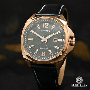 Les montres de la collection Endicott de CITIZEN® marient progrès technologiques et allure sportive. Mot d’ordre pour leur conception : polyvalence et confort en toute occasion. Issu de la collection Sport Luxury, ce modèle comporte un boîtier et une lunette en acier inoxydable aux teintes or rose et un bracelet en cuir noir. Le tout met en valeur un cadran noir à trois aiguilles lumineuses renfermant un indicateur de date et un marqueur luminescent. Dotée de la technologie Eco-Drive de CITIZEN, cette montre est alimentée par la lumière sous toutes ses formes. N’a jamais besoin de pile.
