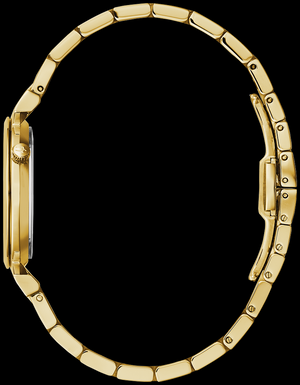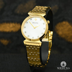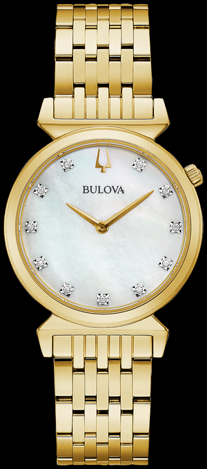 Inspirée des garde-temps de l'héritage Bulova, la Regatta en acier inoxydable de couleur or présente un cadran en nacre blanche serti de 11 diamants, la couronne à la position 2 heures et des cornes angulaires uniques. Verre saphir plat, mouvement à quartz fin et résistance à l'eau jusqu'à 30 mètres.