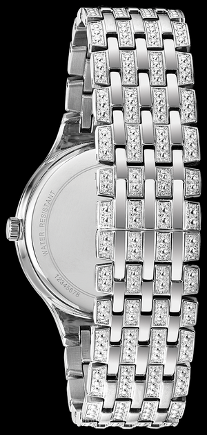 Boîtier et bracelet en acier inoxydable et cadran en pavé blanc argent, orné de 156 cristaux baguettes de déclaration. Boucle déployante, cristal minéral plat, résistance à l'eau jusqu'à 30 mètres.