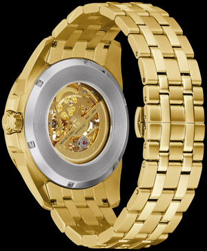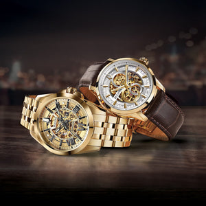 Design sophistiqué avec cadran et fond d'exposition complets. Boîtier à vis en acier inoxydable doré, cadran à trois aiguilles blanc squeletté et argent révélant les rouages complexes du mouvement à remontage automatique à 21 rubis, cristal minéral bombé.