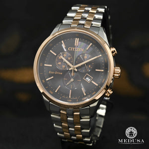 CITIZEN® offre une touche de sophistication à votre collection de montres avec ce chronographe habillé doté d'un verre saphir. Cette belle montre est présentée en acier inoxydable bicolore doré avec un cadran noir. Les caractéristiques supplémentaires incluent un chronographe d'une seconde mesurant jusqu'à 60 minutes, une heure sur 12/24 heures et une date. Résistant à l'eau jusqu'à 100 mètres.
