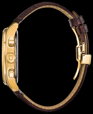 Quartz chronograph inspired by heritage with gold stainless steel case, silver white six-hand dial with day/date function, domed mineral crystal, gold stainless steel bracelet with fold-over push-button clasp, and 30 meters water resistance.