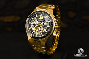 From the classic automatic collection. New Sport style in two-tone gold and bronze IP stainless steel case, black open-heart dial with gold accents and black inner ring, case back, skeleton automatic movement with 40-hour power reserve, sapphire crystal, gold stainless steel bracelet with double push deployment clasp and 100 meters water resistance.