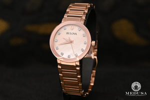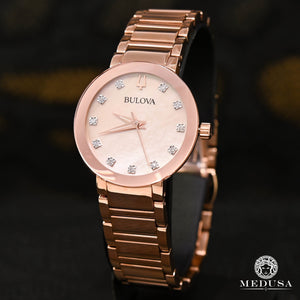 From the Futuro collection. In rose gold stainless steel and 11 diamonds, individually hand-set on a pink mother-of-pearl dial, domed metallic crystal edge to edge metallic, screw-down case, rose gold stainless steel bracelet with double push-button deployment clasp, and water resistance up to 30 meters.
