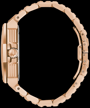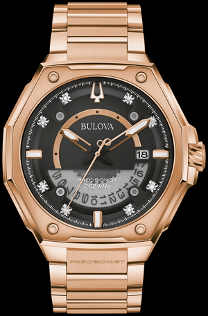 With its distinctive masculine architectural design elements and rose gold stainless steel case and bracelet, this new Precisionist X Diamond men's watch makes a bold first impression. The black 3-hand dial with an exhibition calendar window features 8 elegantly hand-set diamonds and is finished with a curved sapphire crystal. The bracelet has a deployment clasp with pushers for easy release. This luxury watch is water-resistant up to 100 meters and is powered by Bulova's exclusive high-performance 262 kHz 3-hand calendar movement. Take your precision to the next level with this innovative and elegant watch, combining design and technology.