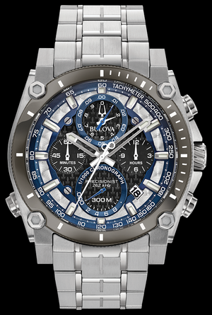 Powered by Bulova's exclusive eight-hand Precisionist quartz chronograph movement with a vibration frequency of 262 kHz, eight times higher than standard watches, for unmatched precision. Screw-down stainless steel and gray IP case with screw-down crown, black carbon fiber chronograph dial with date function, curved mineral glass, stainless steel bracelet with deployant clasp, safety bar and extension, and water resistance up to 300 meters.