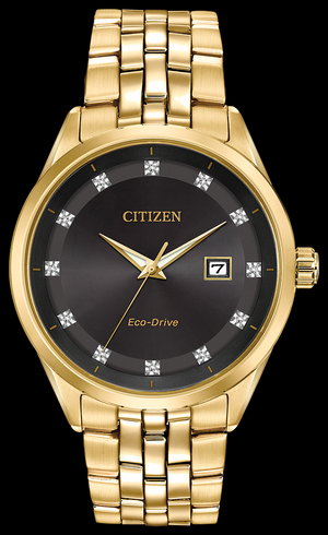 This watch from the CITIZEN® Corso collection is enhanced with vibrant diamond indexes and a sapphire crystal, combining functional simplicity with a touch of elegance. Thanks to Eco-Drive technology, it is more than just a solar watch; it is powered by any light. Presented in a gold-tone stainless steel case and bracelet with a black dial and date.