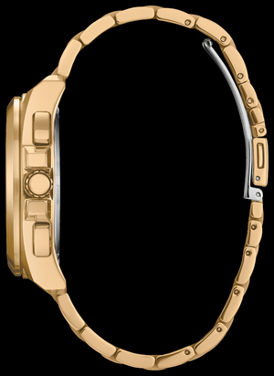 Newly added to Citizen's Classic collection, this men's watch stands out for its presence. The stainless steel case with gold tones houses a black dial equipped with a 1/5 second chronograph measuring up to 60 minutes, 12/24 hour time display, and a date indicator. Its elegant dial is protected by an authentic sapphire crystal. The stainless steel bracelet with gold tones, featuring a fold-over clasp with push buttons, adds refinement and sobriety to this watch. Powered by light in all its forms thanks to Eco-Drive technology, this watch is water-resistant up to 100 meters and never needs a battery. Timeless and highly efficient, this model with a professional look looks great on its owner's wrist.
