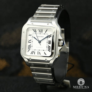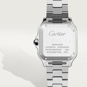Santos watch, medium model, mechanical movement with automatic winding 1847 MC. Steel case, 7-sided crown decorated with a faceted synthetic spinel, silver opaline dial, sword-shaped blued steel hands, sapphire crystal. Steel bracelet with "SmartLink" sizing system. Second calfskin strap with interchangeable steel deployant buckle. Both straps are equipped with the "QuickSwitch" interchangeability system. Case width: 35.1 mm, thickness: 8.83 mm. Water-resistant up to 10 bars (~100 meters).