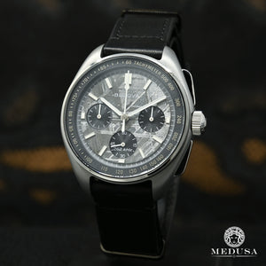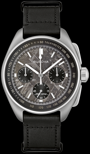 On August 2, 1971, the Bulova pilot chronograph was worn on the moon. It was designed to meet the demands of the lunar environment. Today, Bulova brings this design back to the forefront and updates it with an exclusive high-precision quartz movement, thus continuing its heritage of precision timing with the Bulova Archive series men’s Lunar Pilot chronograph, this time with a unique dial that recalls the history of space conquest. The Lunar Pilot chronograph features a 43.5 mm sandblasted Grade 5 silver titanium case with polished accents, offering dynamism and lightness on the wrist. Slim chronograph pushers and a crown enhanced with the Bulova tuning fork logo are perfectly proportioned and positioned at 3 o’clock. Under the flat sapphire glass, the six-hand chronograph dial is meticulously Made from a genuine Muonionalusta-type meteorite. Discovered in northern Scandinavia in 1906, this 4.5-billion-year-old meteorite offers a varied crystalline pattern that makes each dial unique. A black tachymeter ring provides contrast around the dial, which features a retro Bulova logo. The fine hands and applied markers offer exceptional readability, even in low light thanks to the luminescent coating. The watch features three black subdials inset with circular grooves, each with a distinct function: a 1/20 second stopwatch located at 3 o’clock, a running seconds hand at 6 o’clock, and a 60-minute chronograph at 9 o’clock. The Lunar Pilot watch is powered by Bulova’s exclusive high-precision quartz movement vibrating at a frequency of 262 kHz for unparalleled accuracy and offering a chronograph seconds hand. The watch comes with a fitted black leather strap that attaches easily for quick changes. This edition is limited to 5,000 pieces and presented with a storybook, a card certifying the limited edition, and a certificate of authenticity. The Bulova Lunar Pilot revives the past with a design inspired by the history of space exploration, ideal for the modern adventurer.