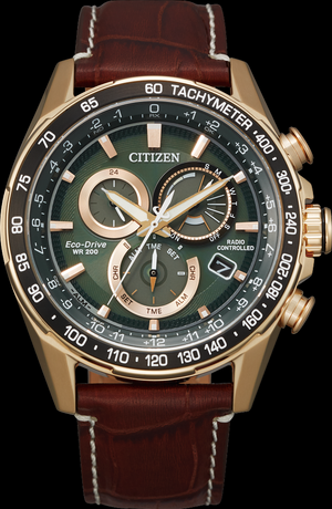 The CITIZEN® Perpetual Chrono A-T is a must-have watch for any enthusiast. Additional features include atomic timing with synchronized time adjustment in 43 cities worldwide, Eco-Drive technology, a perpetual calendar, a power reserve indicator, and a chronograph. It features a brown leather strap and a 43 mm rose gold stainless steel case with an elegant green dial. For those looking to combine timelessness and technology, this watch will hit all the right buttons.