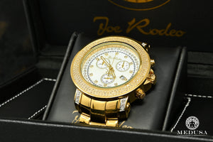 This Joe Rodeo watch is decorated with high-quality genuine diamonds and comes with a fully functional SWISS chronograph movement, a stainless steel case, and a numbered and individually engraved stainless steel back. Water-resistant up to 100m (330ft). This diamond watch is guaranteed 100% brand new and authentic and will be delivered in original manufacturer packaging with two additional bands and all original documents.