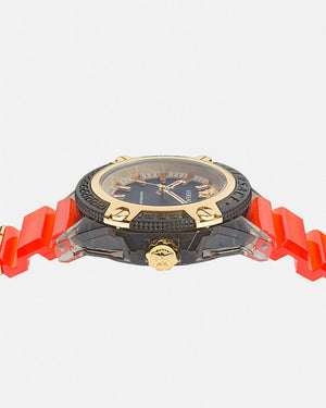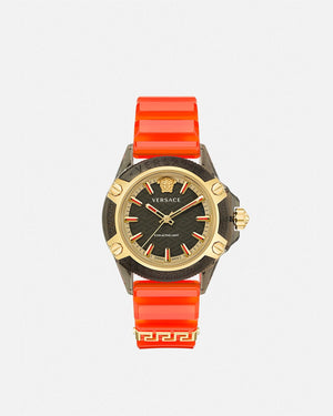 The Icon Active watch is a modern and sporty watch with transparent elements. Featuring the Medusa and Versace logo at 12 o'clock, a Greca buckle accentuates the metal band. This Indiglo edition features a 3-hand movement and lights up in the dark.