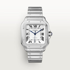 Santos watch, large model, mechanical movement with automatic winding 1847 MC. Steel case, 7-sided crown adorned with a faceted synthetic spinel, silver opaline dial, sword-shaped blued steel hands, sapphire crystal. Steel bracelet with "SmartLink" sizing system. Second calfskin strap, with interchangeable steel deployant buckle. Both straps are equipped with the "QuickSwitch" interchangeability system. Case width: 39.8 mm, thickness: 9.08 mm. Water resistant up to 10 bars (~100 meters).