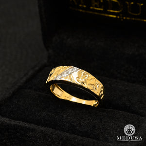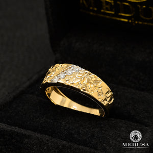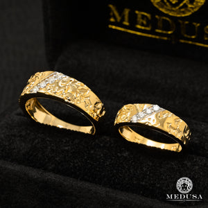 Men's band with women's diamond ring in ''Nugget'' style. The diamond is the most common precious stone for an engagement ring or wedding band. It is the supreme emblem of love because it symbolizes purity and eternity.