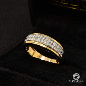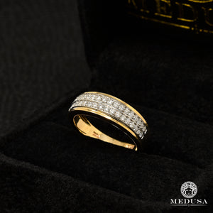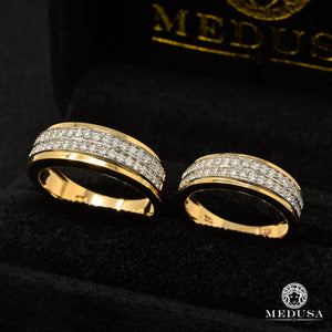 Men's band with women's diamond ring. The diamond is the most common precious stone for an engagement ring or wedding band. It is the supreme emblem of love because it symbolizes purity and eternity.
