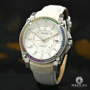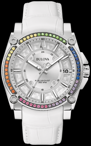 From the Icon collection, this luxury watch is an astonishing interpretation of modern design, powered by Bulova's most advanced Precisionist movement technology. Featuring angular lines and pronounced facets, the 40mm silver stainless steel case presents a hand-set bezel with a rainbow of 52 vivid 1.5mm sapphires totaling 1.04 carats. The case is equipped with a curved sapphire crystal and is water resistant to 100m. A radiant silver dial features a grooved texture and is segmented by applied silver indices, with silver hands filled with luminescent material. The large seconds hand features the signature "P" counterweight, denoting the Bulova Precisionist movement powering the watch. The Precisionist movement is a revolutionary 8-jewel quartz mechanism accurate to 5 seconds per month and offering increased resistance to temperature changes. A white grained crocodile leather strap with a push-button deployant clasp allows the rainbow bezel to stand out. Celebrate timeless design with this exquisite watch from the Bulova Icon collection.