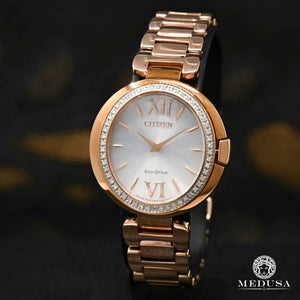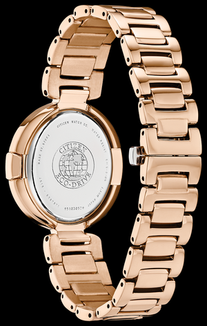 CITIZEN® reaches a new modern standard with its Capella collection. Elegant curves, seamless aesthetics, and technical expertise are all highlighted by the original watches in this collection. Diamond model shown with a deep rose gold stainless steel case and bracelet and a silver dial with an integrated crown, creating a harmonious structure. Equipped with CITIZEN's Eco-Drive technology and powered by light, in all its forms. Never needs a battery.