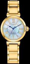 The latest addition to our women's watch collection, the Citizen L Mae model, embodies prestige with its clean lines and romantic touches. The case, whose shape evokes that of a retro perfume bottle and whose elegant curved lines recall lily of the valley bells, houses a dial highlighting a distinctive detail at the 3 o'clock position, where the crown also resembles the bottle's closure cap. This watch features a white mother-of-pearl dial Made made from recycled materials sourced from pearl oyster shells discarded after harvest, and is equipped with a stainless steel case and bracelet in gold tones. The dial is enhanced by a diamond at the 8 o'clock position and topped with an anti-reflective sapphire crystal. Powered by Citizen's exclusive sustainable Eco-Drive technology, fueled by light in all its forms and never requiring a battery, this modern high-performance women's watch pairs perfectly with any smart outfit. Caliber number: E031.