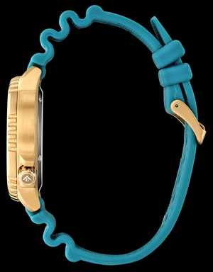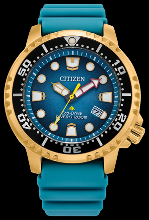 Explore the deepest depths with the latest Promaster Dive in a new elegant color. This essential dive watch features a gold stainless steel case, a turquoise 3-hand dial with date function, as well as luminous hands and markers. The durable matching turquoise polyurethane strap with buckle closure completes the look for a comfortable fit. Equipped with our sustainable Eco-Drive technology powered by any light that never needs a battery, you will wear this high-performance watch in style, from adventures on land to deep blue seas. ISO compliant and water-resistant up to 200 meters. Caliber E168.