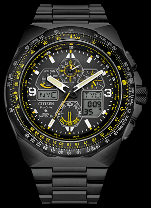 Citizen is proud to launch the latest men's Promaster Skyhawk A-T watch. This extraordinary watch features a black stainless steel case surrounding a black dial covered with genuine sapphire crystal. Additionally, this model is characterized by atomic timekeeping with synchronized time adjustment for enhanced precision, time setting in 43 world cities, a 1/100 second chronograph capable of measuring up to 24 hours, a perpetual calendar, 2 alarms, a 99-minute countdown timer, a backlit digital display, coordinated universal time (UTC) display, and a power reserve indicator. The black stainless steel bracelet fastens with a fold-over clasp with hidden push buttons. Powered by light in all its forms thanks to our Eco-Drive technology, this extremely precise and water-resistant watch up to 200 meters never needs a battery.