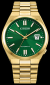 The "Tsuyosa" automatic, from the NJ015 series, brings an ultra-modern sporty style directly to your wrist. Executed in a versatile 40 mm size, the watch's sophisticated design makes a strong impression thanks to a gold stainless steel case and a perfectly integrated matching bracelet. Under an anti-reflective sapphire crystal, the sporty watch features a sunray green dial, with a date window at 3 o'clock and contrasting gold details adding to its classic aesthetic. Powered by an automatic movement and offering up to 50 meters of water resistance, this refined watch is a choice to wear daily, ready for work, leisure, and everything else. Caliber 8210.