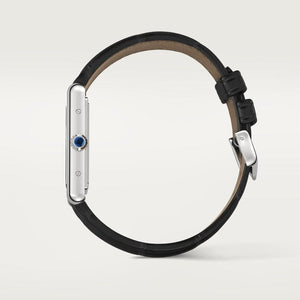 Montre Tank Must, grand modèle, mouvement à quartz. Boîte en acier, couronne perlée ornée d'un spinelle de synthèse en forme de cabochon, cadran laque noire, aiguilles en forme de glaive en acier rhodié, bracelet en alligator semi-mat noir, boucle ardillon en acier. Taille de la boîte : 33,7 x 25,5 mm, épaisseur : 6,6 mm. Etanche jusqu'à 3 bar (~30 mètres).
