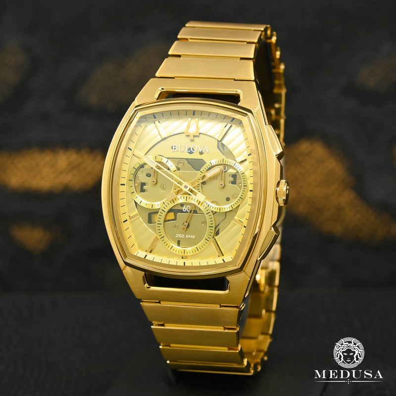 L'excitation révolutionnaire du premier mouvement chronographe incurvé au monde se poursuit, alors que Bulova réinvente à nouveau ce que devrait être une montre. Un nouveau boîtier Curved Tonneau souligne les lignes fluides de la collection CURV - tout en offrant une nouvelle esthétique distincte - une fois de plus, faisant une déclaration de conception soutenue par l'innovation technologique. Il est doté d'un boîtier en forme de tonneau en acier inoxydable doré et d'un cadran champagne doté d'un verre saphir incurvé et d'un revêtement antireflet. Il est associé à un bracelet en acier inoxydable doré et à une fermeture à bouton-poussoir déployant pour un design sans couture. Cette montre de luxe pour homme se sentira aussi innovante et unique à l’avenir qu’aujourd’hui, un accessoire parfait pour toute occasion.