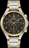 Conjuguant une incomparable finesse à la technologie de pointe de Bulova, cette nouvelle montre à 5 aiguilles pour hommes de Bulova réoriente l’avant-gardiste collection CURV. Dotées du premier mouvement incurvé conçu au monde, les montres de la collection CURV utilisent une technologie à quartz de haute performance de 262 kHz, laquelle offre une précision remarquable de 5 secondes par mois. Ce nouveau modèle CURV se distingue par son boîtier en acier inoxydable argenté et doré agrémenté d’accents polis et brossés surmonté d’un verre en saphir galbé. Ajouré, l’élégant cadran noir à rayures donne un aperçu du mouvement complexe. Doté de marqueurs en acier inoxydable aux teintes or et d’aiguilles qui contrastent avec l’arrière‑plan, le cadran comporte trois sous‑cadrans qui affichent le temps écoulé selon des intervalles de 12 heures, de 60 minutes et de 60 secondes. Le sous‑cadran à la position 6 h fait office de chronomètre de 60 secondes et de trotteuse. Le poussoir situé à la position 4 heures active l’affichage de deux fuseaux horaires. Dotée d’un bracelet assorti en acier inoxydable argent aux teintes or, cette montre s’attache à l’aide d’un fermoir déployant muni de boutons‑poussoirs. Redéfinissant le profil raffiné du premier modèle de la collection CURV, cette nouvelle montre de Bulova incarne l’élégance et la sophistication, la rendant parfaite en toute occasion.