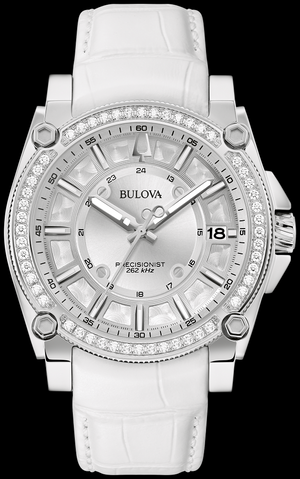De la collection Icon, cette montre est une interprétation étonnante du design moderne, alimentée par la technologie de mouvement Precisionist la plus avancée de Bulova. Se distinguant par des lignes angulaires et des facettes prononcées, le boîtier en acier inoxydable argenté de 40 mm est doté d'une lunette sertie à la main de 52 diamants taille complète éblouissants de 1,5 mm totalisant 0,79 ct. Le boîtier est équipé d'une glace saphir incurvée et est étanche à 100 m. Un cadran argenté rayonnant présente une texture rainurée et est segmenté par des index appliqués argentés, avec des aiguilles argentées avec remplissage luminescent. La grande aiguille des secondes présente le contrepoids signature « P », désignant le mouvement Bulova Precisionist qui alimente la montre. Le mouvement Precisionist est un mécanisme à quartz révolutionnaire à 8 rubis précis à 5 secondes par mois et offrant une résistance accrue aux changements de température. Le design est complété par un bracelet en cuir grainé de crocodile blanc avec une boucle déployante à bouton-poussoir. Adoptez un nouveau niveau d'élégance avec cette superbe montre de la collection Bulova Icon.