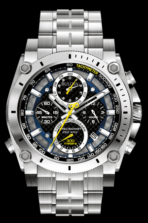 De la collection Precisionist avec un chronométrage précis au 1/1000ème de seconde et une trotteuse à balayage continu, le chronographe Precisionist est particulièrement raffiné. En acier inoxydable avec verre bombé, fibre de carbone noire multicouche, cadran bleu, argent et noir, trotteuse jaune, aiguilles des heures et des minutes lumineuses, index lumineux, calendrier, boîtier vissé, couronne vissée et double fermoir sécurisé. boucle déployante à pression avec verrouillage de sécurité. Alimenté par le mouvement Precisionist à cristal de quartz à trois broches exclusif de Bulova avec une fréquence de vibration de 262 kHz huit fois supérieure à celle des montres à quartz standard pour une précision inégalée.