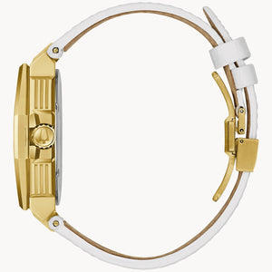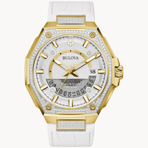 Cette superbe nouvelle montre pour homme Precisionist X Diamond ne manquera pas de faire une impression durable. La conception architecturale masculine de cette montre remarquable est ponctuée de 174 diamants sertis à la main, totalisant 0,83 ct et sertis à la main sur un boîtier en acier inoxydable doré et argenté. Le cadran de calendrier à 3 aiguilles blanc argenté est détaillé avec une fenêtre de calendrier d'exposition et est fini avec un verre saphir incurvé, offrant un effet sophistiqué et poli. Le look est complété par un bracelet en cuir blanc avec une boucle déployante avec des poussoirs pour une libération facile. Cette montre de luxe est étanche jusqu'à 100 mètres et est alimentée par le mouvement de calendrier à 3 aiguilles haute performance 262 kHz exclusif de Bulova. Faites passer le style audacieux au niveau supérieur avec cette montre innovante, alliant design et technologie.