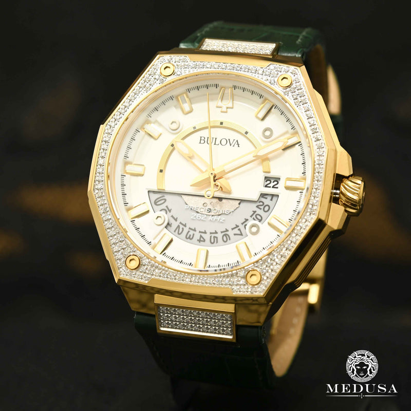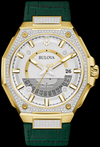 Définie par le raffinement et motivée par l'innovation, cette montre de la série X allie la technologie la plus avancée de Bulova avec un design véritablement luxueux. Le design distinctif du boîtier présente une construction en acier inoxydable doré et à facettes, avec un mélange de finitions polies et brossées, un verre saphir incurvé avec revêtement antireflet, ainsi qu'une lunette et un bracelet ornés de 174 diamants de 1 mm sertis à la main totalisant 0,83. ctw. Le cadran saisissant présente une finition argentée brossée avec des aiguilles dorées et des marqueurs appliqués avec remplissage luminescent, un guichet de date et une aiguille des secondes avec un balayage doux. Une ouverture translucide dans le cadran offre un aperçu du mouvement Precisionist exclusif de Bulova, un mécanisme à quartz révolutionnaire à 8 rubis précis à 5 secondes par mois et avec une résistance accrue aux changements de température. La montre a une résistance à l'eau de 100 m et est associée à un bracelet en cuir grainé de crocodile audacieux d'un vert foncé, avec une boucle déployante à bouton-poussoir. Un classique instantané, cette montre Bulova offre une élégance distinguée dans chaque environnement.