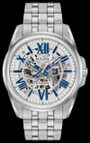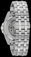 Design sophistiqué avec cadran et fond d'exposition complets. Boîtier à vis en acier inoxydable, cadran à trois aiguilles blanc squeletté et argent révélant les rouages complexes du mouvement à remontage automatique à 21 rubis, cristal minéral bombé.