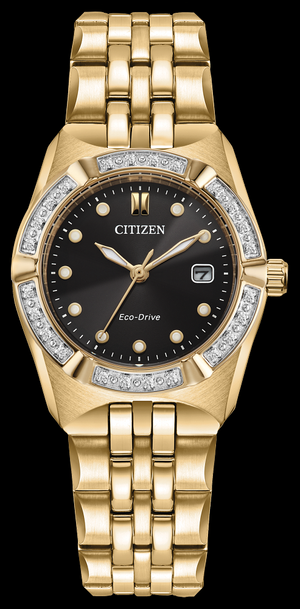 Un indémodable chez la gent féminine, la montre Corso de Citizen est maintenant plus éclatante que jamais. Cette élégante montre comporte un boîtier doré de 28 mm en acier inoxydable avec bracelet assorti, et une lunette ornée de diamants surmontée d’un cadran noir muni de trois aiguilles luminescentes, d’un indicateur de date et de marqueurs dorés. De plus, elle est dotée d’un fermoir dépliant muni de boutons‑poussoirs dissimulés. Elle est également hydrorésistante jusqu’à 100 mètres. Le modèle Corso comblera quiconque à la recherche d’une montre élégante qui apporte une touche de raffinement à toute tenue. Dotée de la technologie Eco-Drive de Citizen, cette montre est alimentée par la lumière sous toutes ses formes, et ne nécessitera donc jamais de pile. Numéro du calibre : E011.
