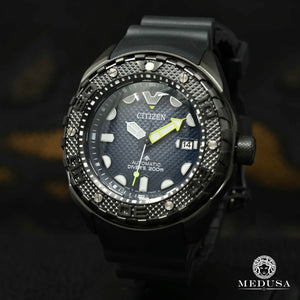 Plongez-vous dans une nouvelle collection de montres de plongée automatique avec un lien profond avec l’histoire d’innovation et de technologie exclusive de Citizen. La nouvelle montre Promaster Automatic Diver 200M est dotée d'un boîtier Super Titanium™ avec revêtement Duratect DLC qui est léger et durable. La lunette a des languettes inclinées pour une prise facile, et la lunette et le cadran ont un design de clous pyramidaux qui entourent un verre saphir antireflet à double sphère, et le cadran bleu foncé complète le boîtier en titane et le bracelet en polyuréthane noir pour une esthétique forte. de sport, de style et de performance. Alimentée par le mouvement de votre poignet, cette montre automatique avancée dispose d'une réserve de marche de 42 heures et de grandes aiguilles et marqueurs lumineux appliqués pour vous offrir une lecture facile dans l'obscurité ou sous l'eau. Il est livré dans une boîte noire collector exclusive et comprend un bracelet d'extension et est conforme à la norme ISO avec une couronne vissée et étanche jusqu'à 200 mètres. Calibre 9051.