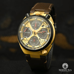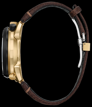 L’édition du 50ᵉ anniversaire de la Tsuno Chrono Racer Promaster est une montre de haute performance au design indéniablement distinctif. Inspiré par la montre Bullhead de Citizen originale de 1973, ce chronographe hors du commun est doté d’un boîtier en acier inoxydable bicolore de 45 mm tenu par un élégant bracelet en cuir marron. Doté d’un cadran doré, le design fait appel à quatre sous-cadrans noirs rehaussés par des aiguilles rouges pour créer un effet dynamique et sportif. Cette montre offre le mouvement assemblé à la main, un chronomètre au 1/5 de seconde avec fonction flyback qui peut mesurer jusqu’à 12 heures, une alarme, un compteur de réserve d’énergie et une fenêtre affichant la date. Fidèle aux normes de robustesse de la collection Promaster, cette montre est hydrorésistante jusqu’à 200 mètres. Dotée de la technologie exclusive Eco-Drive de Citizen, elle est alimentée par la lumière pour un fonctionnement constant et durable, sans pile. Numéro du calibre : E210.