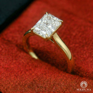 Bague de fiançailles à diamants style ''Solitaire Radiant Cut''. Le diamant laboratoire est la pierre précieuse la plus répandue pour une bague de fiançailles avec un look et une grosseur optimal.